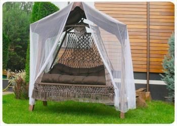 Подвесные качели качели СЕАРА – это, прежде всего необычный дизайн! Подвесные качели СЕАРА можно закрепить конструкцией верхним креплением или подвесить на надежный деревянный каркас КАРАВЕЛЛА. Красивые удобные качели сплетены вручную изящным узором из приятной на ощупь полиамидной нити. Оригинальная деталь – это разнообразный узор плетения дан для строп, спинки, бахромы внизу и необычной маленькой крыши с бахромой наверху. В сочетание с двумя большими мягкими подушками на сидение и спинку качели СИЕНА позволят комфортно расположиться, это волшебные минуты отдыха. Плетеные качели СИЕНА для Вас, детей и всех, кто ценит красоту комфорт и качество.