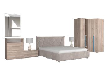 - Особенности: включает зеркало, тумбы, шкафы, стеллаж, комод и кровать