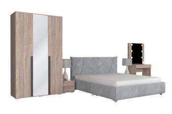 Гарнитур выполнен в современном стиле и подойдет для просторных спален. Зеркало в трюмо и продуманная система хранения делают этот комплект особенно практичным.
