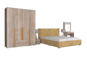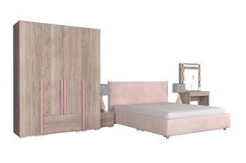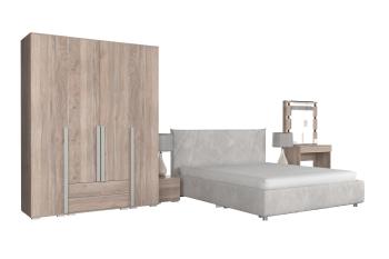 - Особенности: включает зеркало, тумбы, туалетный столик, кровать и шкафы