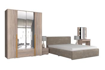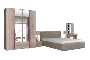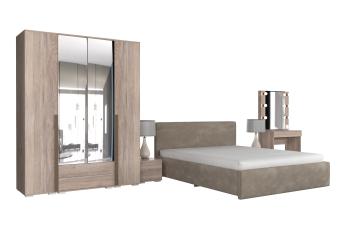 - Особенности: включает зеркало, тумбы, туалетный столик, кровать и шкафы