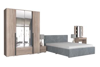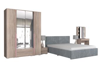 - Особенности: включает зеркало, тумбы, туалетный столик, кровать и шкафы