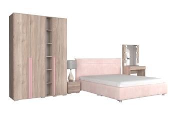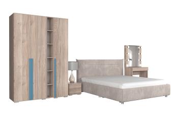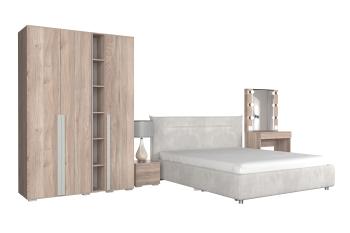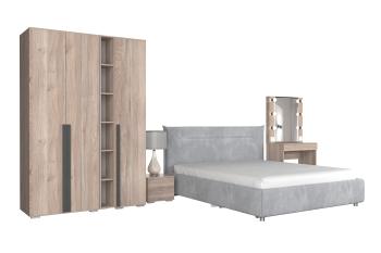 - Особенности: включает зеркало, тумбу, туалетный столик, кровать, шкаф и стеллаж