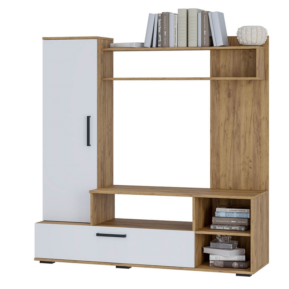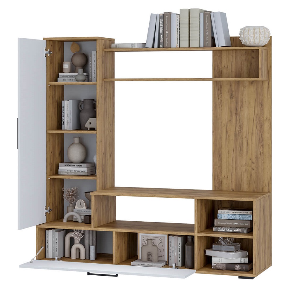 Изготовленная из ЛДСП, корпус выполнен в цвете дуб крафт, а фасады — в белом оттенке. Размеры ниши под телевизор составляют 110х42,4х90 см, что позволяет разместить технику с комфортом. Сборка данной модели не универсальная, что делает ее более специализированной для определенных интерьеров.