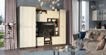 Гостиная содержит центральную секцию под ТВ с обилием открытых полок, вместительный шкаф со штангой и пенал с полками для одежды, а так же удобные ящики и дополнительные секции под необходимые вещи.