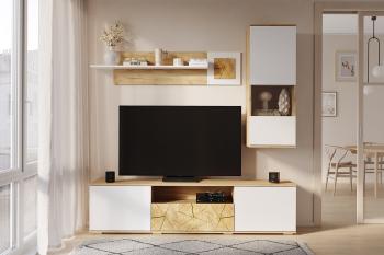 Гостиная BTS Тиволи. Комплект 1 — это гармоничное сочетание изысканного дизайна и практичности. Оригинальные вставки с имитацией спила дерева придают каждому элементу коллекции яркий акцент, создавая уникальный стиль. Корпуса в цвете дуб крафт золотой прекрасно сочетаются с белыми фасадами, добавляя интерьеру свежести и элегантности.