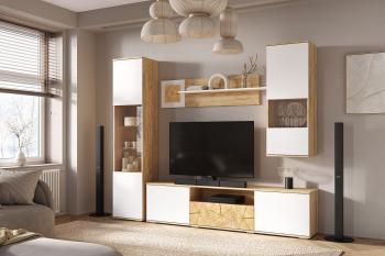 Гостиная BTS Тиволи. Комплект 4 — это идеальное сочетание изысканного стиля и функциональности. Коллекция выделяется оригинальными вставками с имитацией спила дерева, которые придают каждому элементу яркий акцент. Корпуса в цвете дуб крафт золотой гармонично сочетаются с белыми фасадами, создавая современный и элегантный вид.
