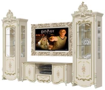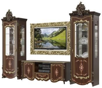 В комплектации № 1 гостиная Шейх состоит из двух шкафов-витрин 1-дверных левого и правого, солидной тумбы TV, резной рамки для TV. Креативный подход к составлению мебельного ансамбля сохраняет в гостиной эксклюзивный дизайн коллекции Шейх. Роскошная стеночка для уголка отдыха восхищает изысканной красотой, богатством отделки и визуальной лёгкостью. Своей воздушной прелестью гостиная Шейх обязана изяществу форм, обилию стеклянных вставок, блеску декора.