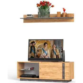 Тумба под телевизор Mobi Арчи №7 – это идеальное сочетание функциональности и современного дизайна в стиле лофт. Модель выполнена в элегантном цвете "дуб крафт золотой" с контрастными вставками "камень тёмный", что придаст вашей гостиной особый шарм.
