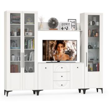 Гостиная Валенсия № 98 от бренда Mobi – это современное решение для вашего интерьера, сочетающее в себе элегантный дизайн и практичность. Модульная конструкция выполнена в белом цвете с эффектом шагрени, что придает мебели благородный и стильный вид.