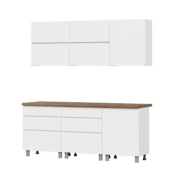 Кухонный гарнитур Герда – это идеальный по габаритам и наполнению комплект модулей. Набор навесных и напольных шкафов в белом исполнении дополнен массивной влагостойкой столешницей со сложным древесным рисунком, имитирующим состаренный дуб с трещинами и сучками благородного цвета. Кухня Гердаимеет 6 выкатных ящиков на шариковых направляющих и модуль под врезную мойку по своей нижней части, стоит на регулируемых цилиндрических опорах декора «Матовый хром». В верхней части кухни установлены 4 отсека для хранения на газлифтах и распашной модуль с полкой для хранения посуды.