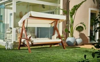 Невероятно удобная и универсальная модель – широкие подлокотники позволят вам поставить чашку чая или бокал вина. Качели можно легко разложить, и они превратятся в большой лежак, на котором можно комфортно вздремнуть на свежем воздухе.