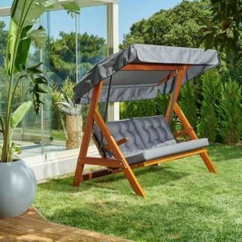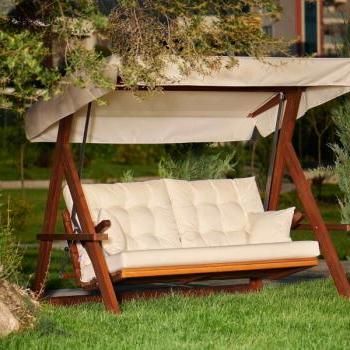 Большие и комфортные 3-местные качели из массива сосны, выполненные из экологически чистых материалов. Подушки со съемными чехлами входят в комплект с качелями.