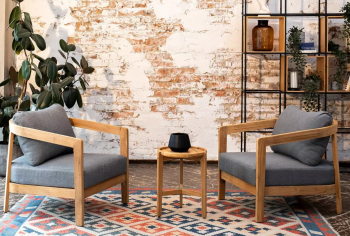 Кресло из тика VENTO- арт. 39503, размеры: 71 × 84 × 70.5 cм- 2 шт, Боковой стол из тика ASPEN-арт.38202,размеры :Dia 40/50 cм-1 шт. Материал — массив тика, отделка экомаслом, цвет – натуральный тик Анодированная фурнитура из нержавеющей стали Подушки – ткань Olefin, цвет подушек – светло-серый Древесина, из которой изготовлена мебель, имеет сертификацию FSC (Forest Stewardship Council) – гарантия качества и происхождения древесины.Производство Вьетнам.