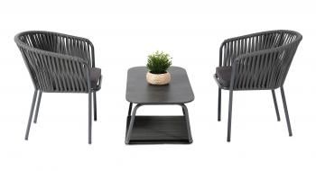 Кофейный набор «Тулон» состоит из: – журнального столика 900х500х400 мм – двух стульев 570х520х800 мм Каркас мебели изготовлен из алюминиевого каркаса темно-серого цвета. Столешница из высококачественного монолитного компакт-пластика HPL толщииной 12 мм, цвет мрамор. Каркас оплетен вручную эластичными синтетическими лентами из высокопрочных полиэфирных волокон. Стулья оснащены подушками серого цвета со съемными чехлами. Предусмотрена влагоотталкивающая пропитка материала. “Гранада” журнальный стол из HPL, цвет “черный мрамор” 1шт. 900Х500Х400, “Бордо” плетеный стул из синтетических лент, цвет темно-серый 2шт. 570Х620Х800,