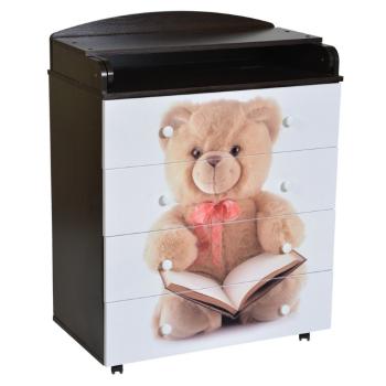 Комод с пеленальным столиком выполнен в классическом дизайне, украшен фотопечатью “Мишки” – удобный недорогой комод. Оснащен четырьмя выдвижными ящиками, на роликовых направляющих, для хранения детских вещей.