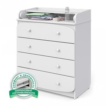 Комод раскладной “Щелкунчик“4 КР 80 К/4 ПВХ – удобный и практичный комод с пеленальным столиком, в силу особенностей современных интерьеров, отличается функциональностью и эргономичностью. Пеленальный столик с откидной крышкой не только помогает маме в переодевании ребенка, но при этом экономит пространство в помещении за счет удобного механизма складывания. 4 вместительных ящика с лёгкостью выдвигаются и задвигаются на шариковых направляющих.