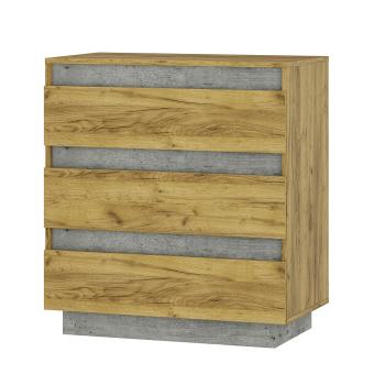 Модульная коллекция для гостиной Эмми выполнена в стиле лофт и отличается сочетанием трендового декора крафт с древесной текстурой и вставками с рисунком под бетон. Оригинальное конструктивное решение коллекции – отсутствие лицевой фурнитуры. Комод оснащен тремя выдвижными ящиками на усиленных направляющих.