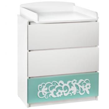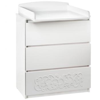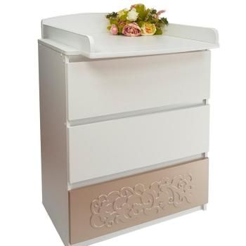 Пеленальный комод “Арабески” надежный и прочный, украшен изысканной аппликацией. Все материалы, применяемые при изготовлении – экологически чистые, гипоаллергенные. Комод имеет 3 больших выдвижных ящика на прочных направляющих. Оборудован съемной пеленальной доской с защитными бортиками.