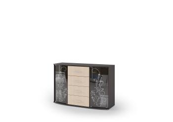 Современный стильный комод К-7 с полками за дверцами из тонированного стекла с оригинальным узором, а также четырьмя выдвижными ящиками на роликовых направляющих.