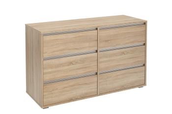 Комод имеет прямоугольную форму и относится к категории низкой мебели. Ширина 120 см позволяет разместить его даже в небольших помещениях, при этом он остается достаточно вместительным. Шариковые направляющие обеспечивают плавное и тихое открывание ящиков, что особенно важно в спальне.