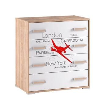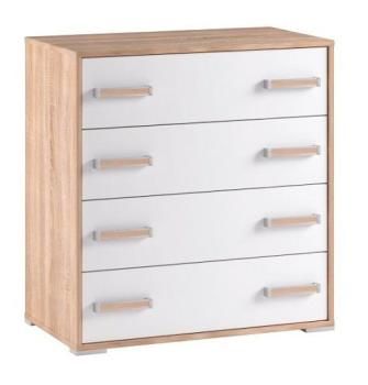 Классический дизайн и светлые спокойные тона делают этот предмет мебели по-настоящему универсальным. Комод с корпусом цвета дуба сонома и глянцевым белым фасадом имеет четыре выдвижных ящика, в которых легко поместится все то, что обычно хранят в спальне – нижнее белье, чулочно-носочные изделия, прочие личные мелочи. Ящики оснащены удобными удлиненными ручками из металла с матовым покрытием.