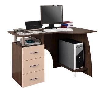 Компьютерный стол «Лорд» имеет три выкатных ящика на роликовых направляющих, полки для системного блока и оргтехники, а также увеличенную столешницу анатомической формы.