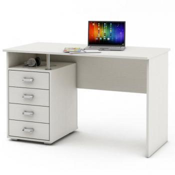дорогостоящий материал – ЛДСП. Мебель обладает линейной формой и оборудована тумбой, ящиками и полочкой. Также имеется место для
