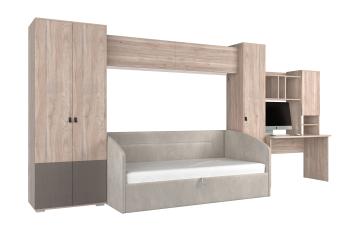 Комплект «Модерн К42» сочетает в себе эргономичность и стильный дизайн. Встроенный стол с надстройкой создает удобное рабочее место для занятий, а кровать-софа экономит пространство в комнате. Два навесных шкафа и два отдельно стоящих шкафа предоставляют достаточно места для хранения вещей и игрушек.