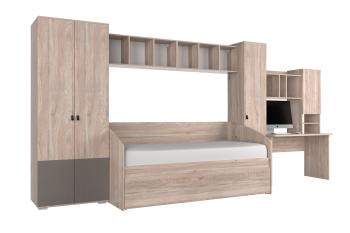 Мебель отличается лаконичным дизайном и продуманной эргономикой. В комплекте предусмотрены все необходимые элементы для комфортного отдыха, учебы и хранения вещей. Кровать-софа шириной 90 см обеспечит здоровый сон, а система хранения с двумя шкафами и полками поможет поддерживать порядок в комнате.