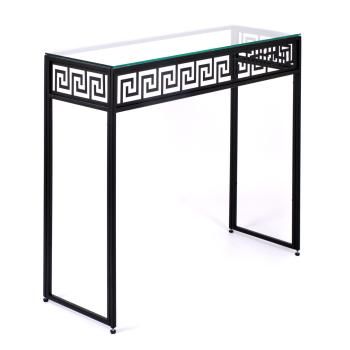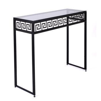 Декоративный консольный столик в современном стиле. Простая, в то же время элегантная модель изготовлена из окрашенного металла и закаленного стекла. Орнамент олеандр придает благородство консоли. Изготавливается в нескольких вариантах: основание выполнено в цвете черный муар или зеркальное золото, а столешница дымчато-серая или прозрачная. Благодаря компактному размеру создаст уют в гостиной или спальне. Оригинальный столик идеальный вариант для коллекционера. Каждый предмет будет эффектно на нем смотреться.