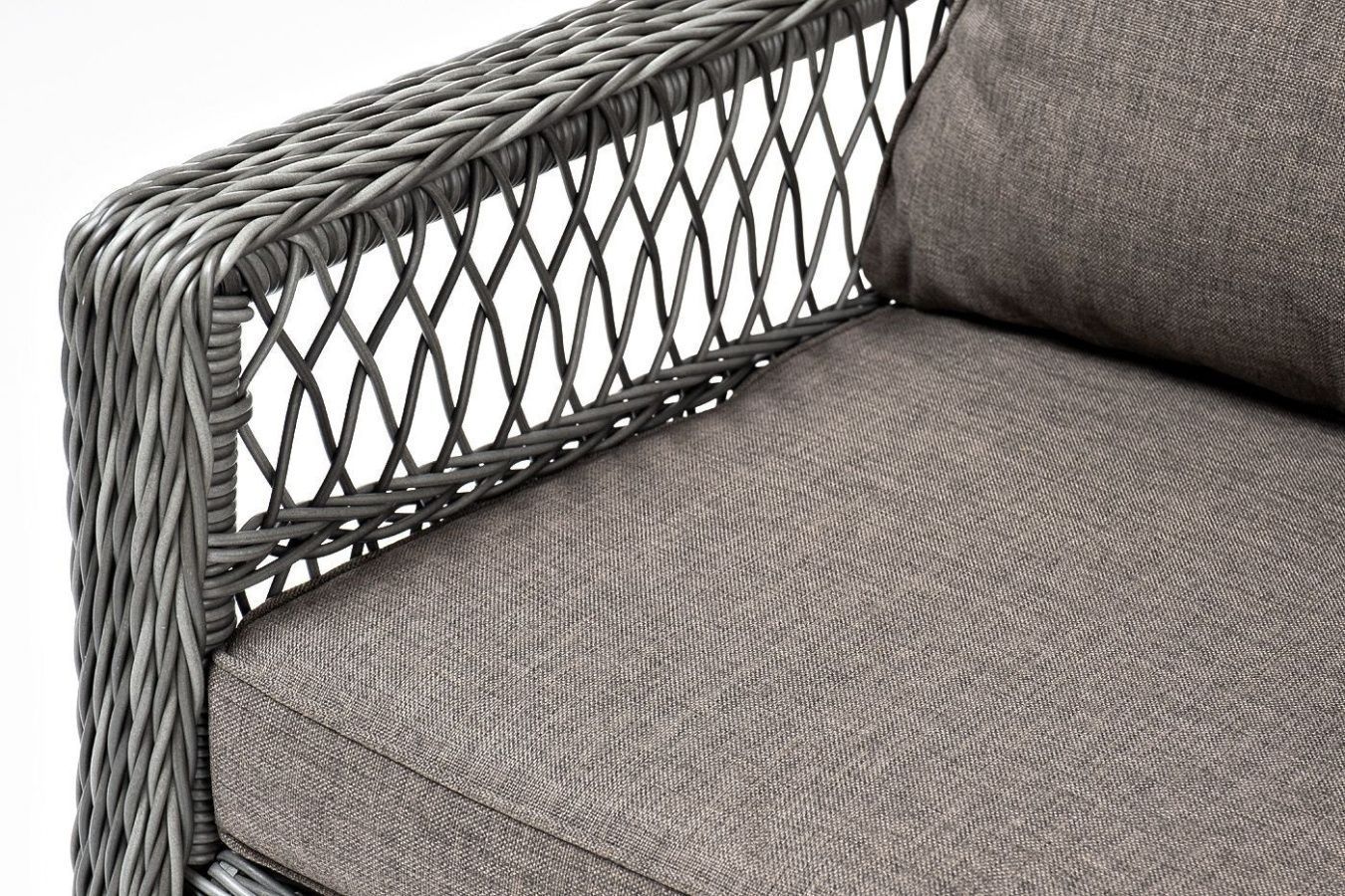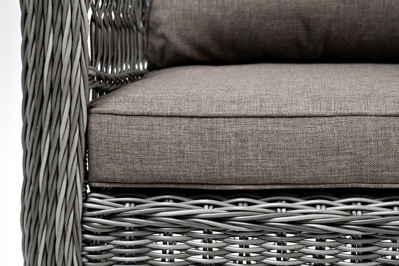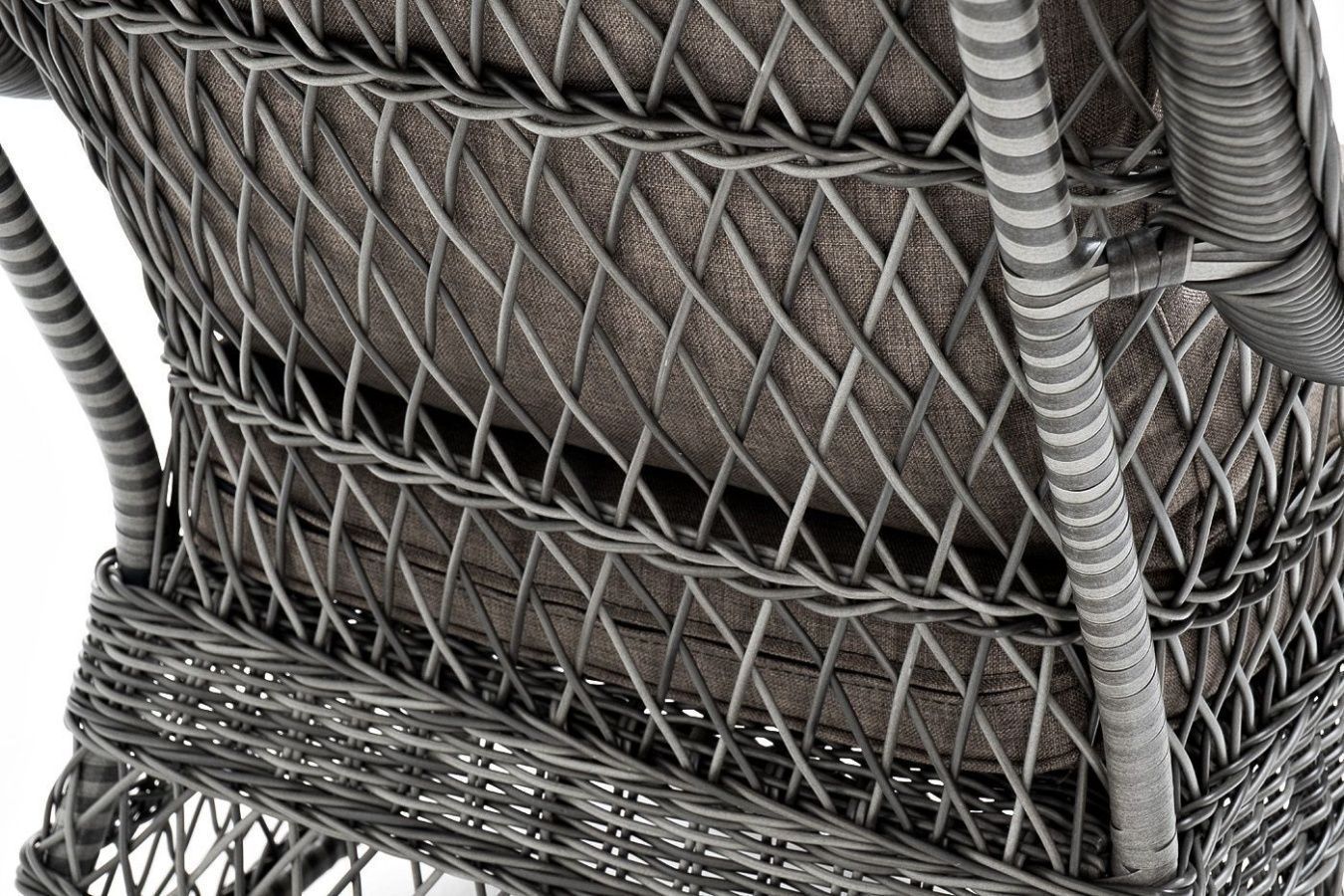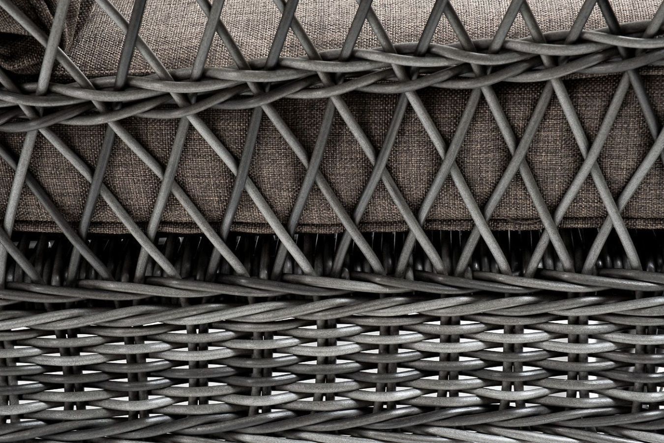 Укомплектовано плетеное кресло удобными мягкими подушками, одна из которых располагается в области спинки. Они выполнены в коричневом оттенке. При пошиве тканевых изделий используется полиэстер, плотностью 230гр/м2. Он в обязательном порядке проходит обработку влагоотталкивающей пропиткой.