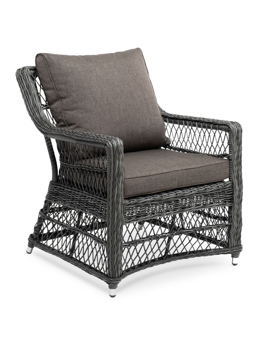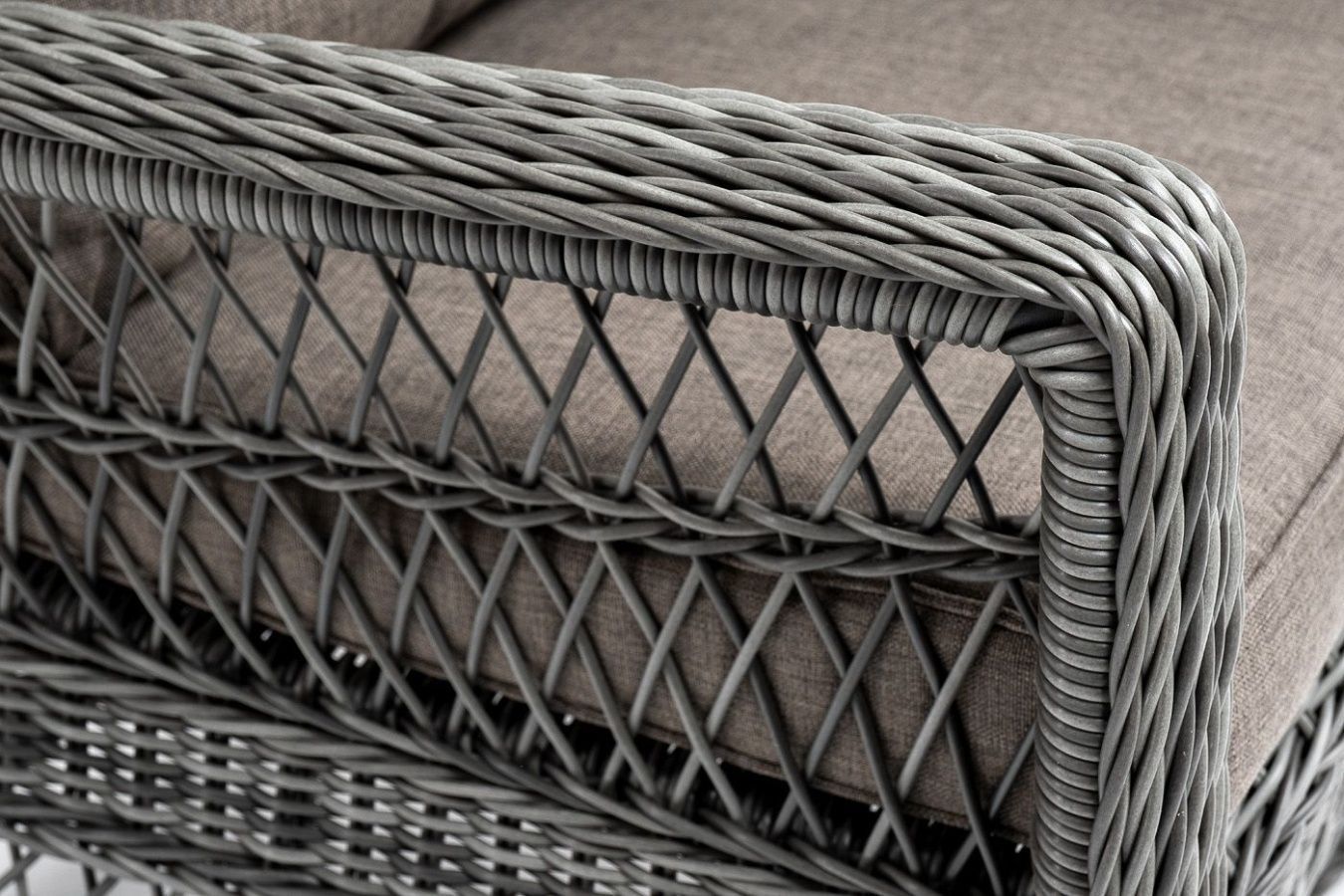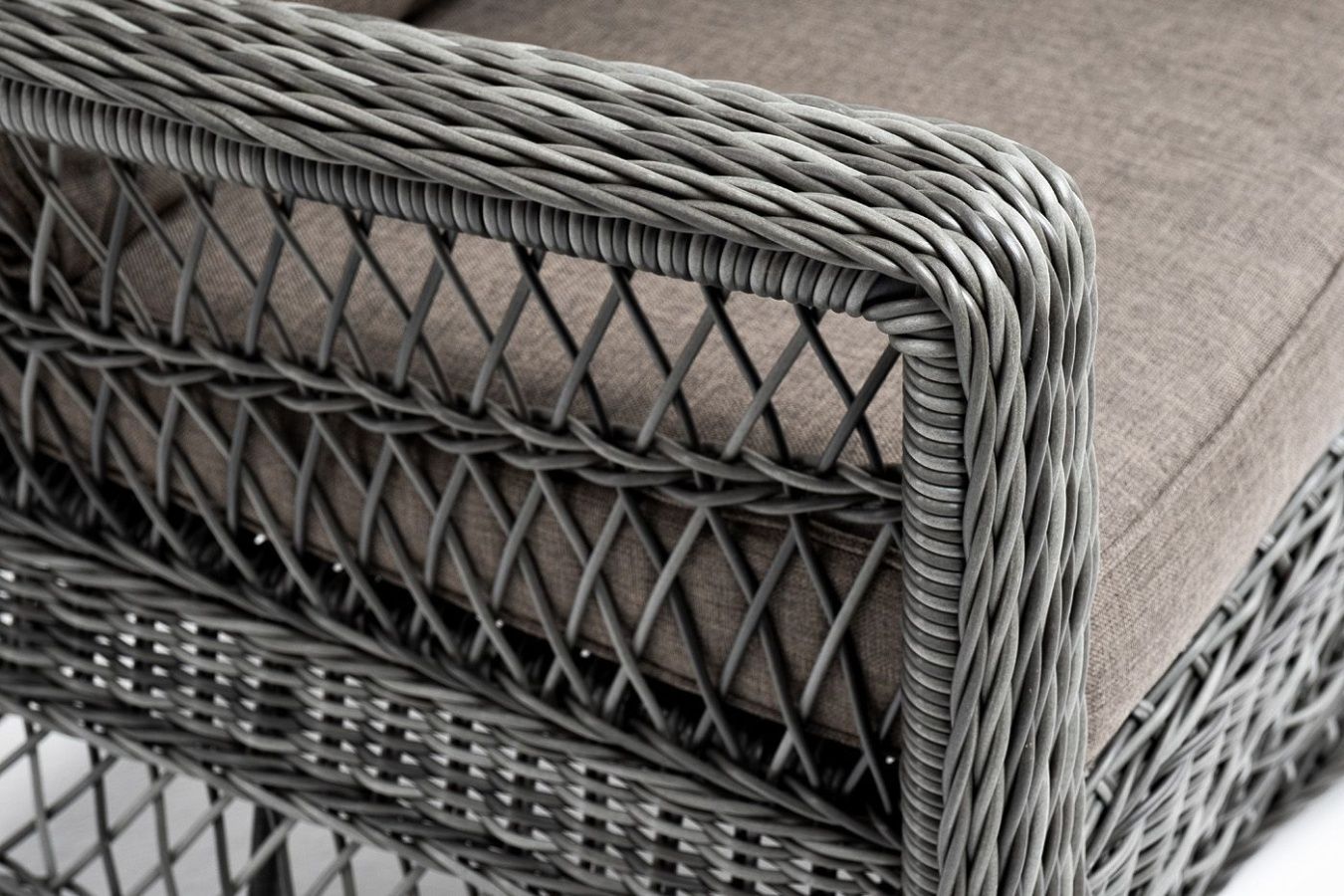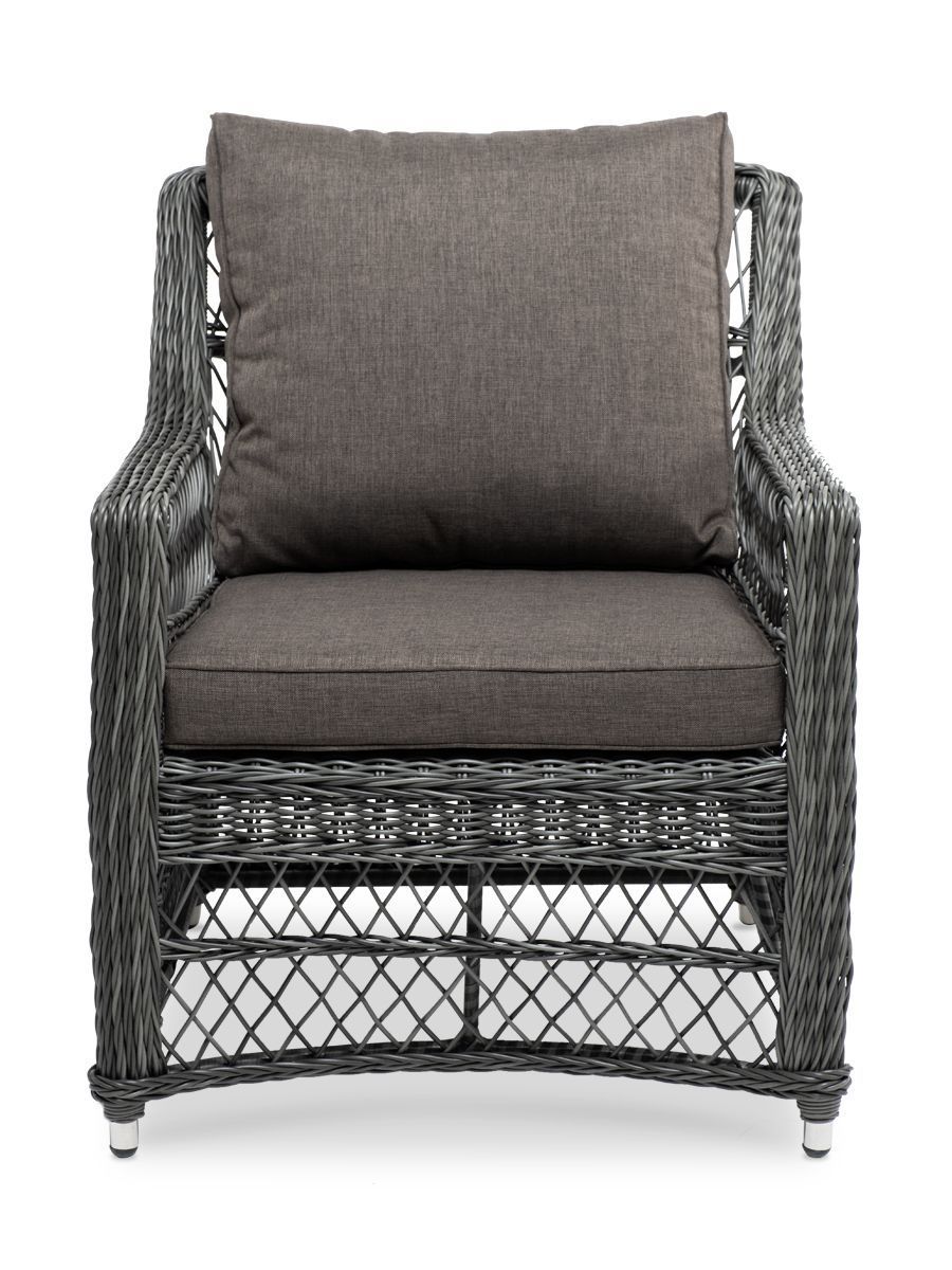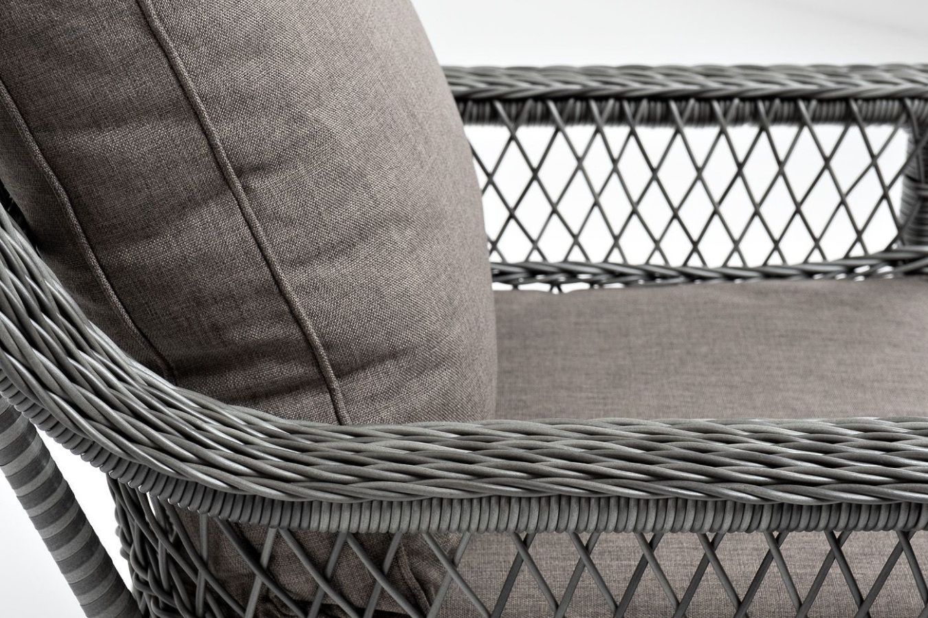 Укомплектовано плетеное кресло удобными мягкими подушками, одна из которых располагается в области спинки. Они выполнены в коричневом оттенке. При пошиве тканевых изделий используется полиэстер, плотностью 230гр/м2. Он в обязательном порядке проходит обработку влагоотталкивающей пропиткой.