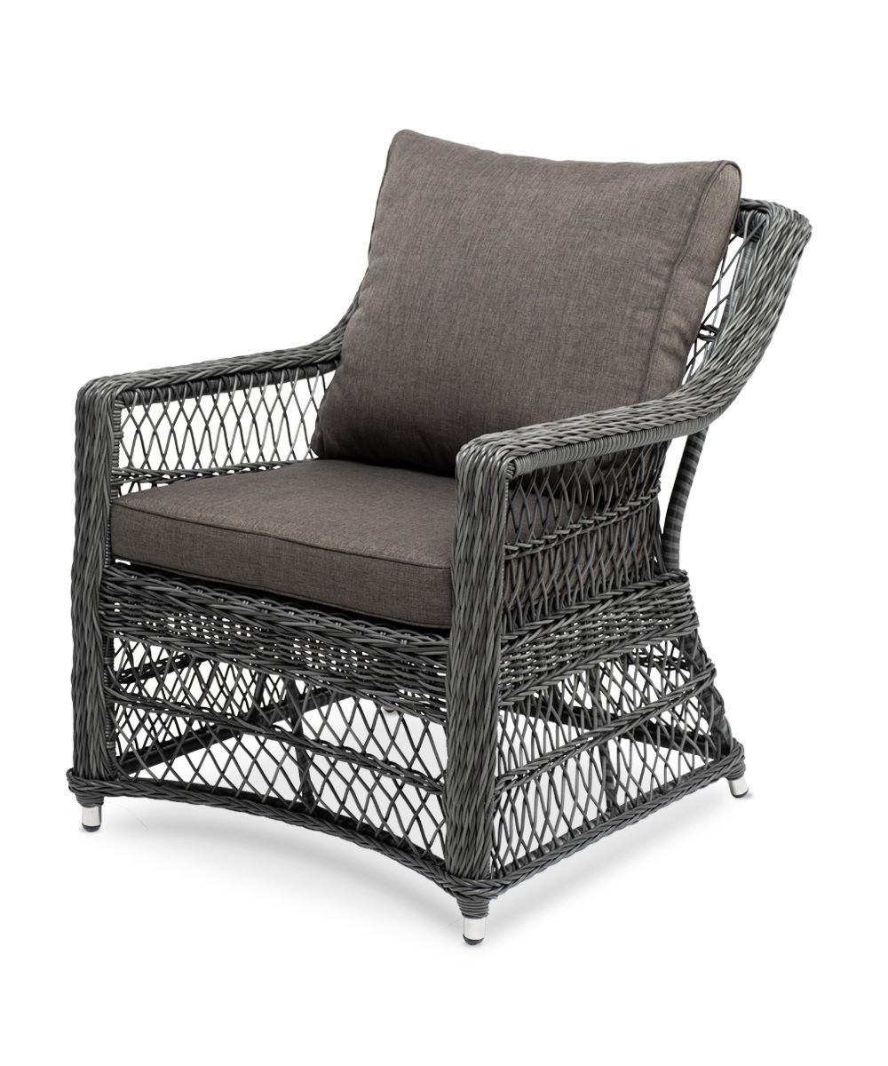 Кресло изготовлена из устойчивого алюминиевого каркаса. Искусственный ротанг украшает мебель в качестве круглого ручного плетения. Оно представлено в коричневом цвете.