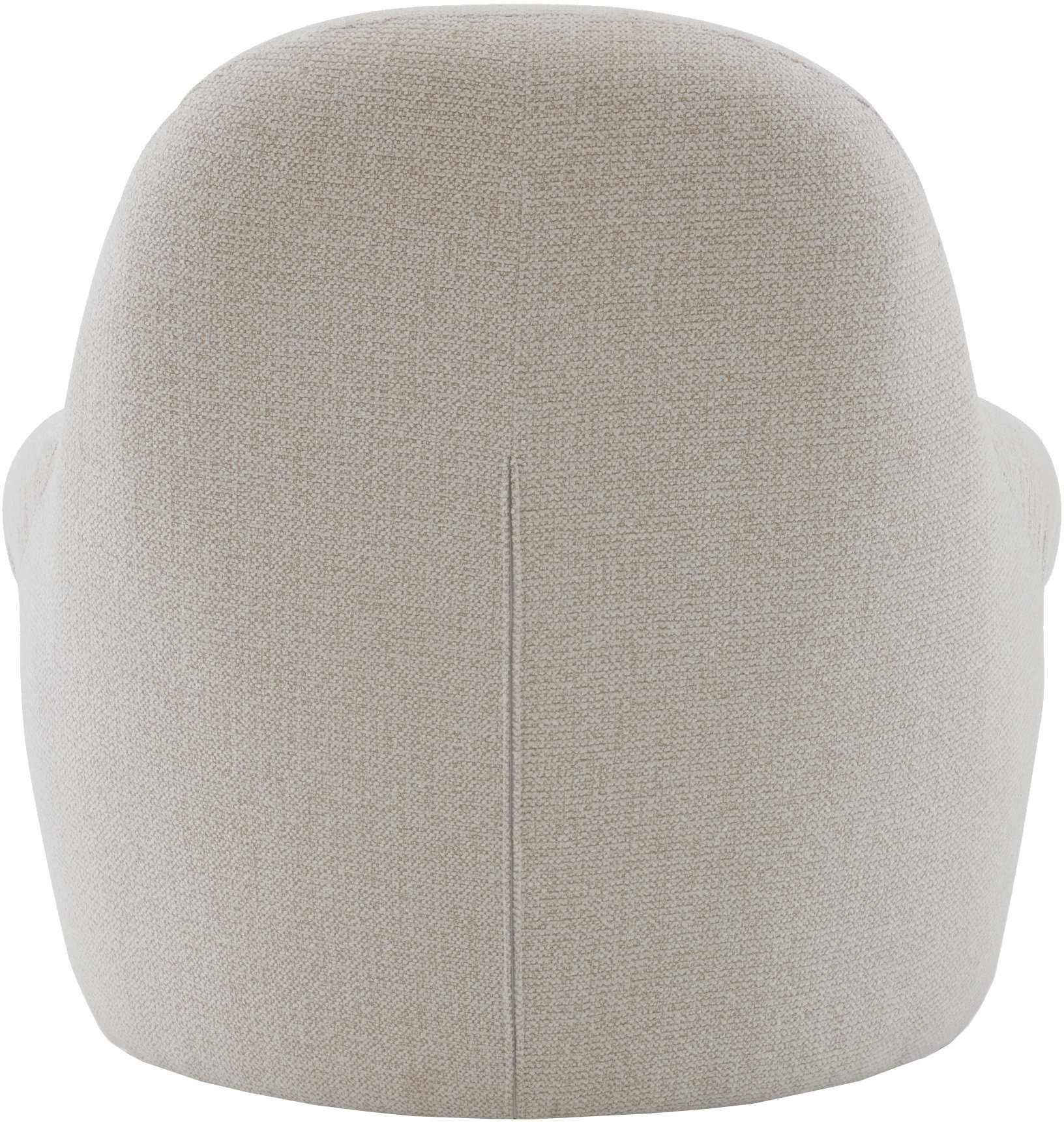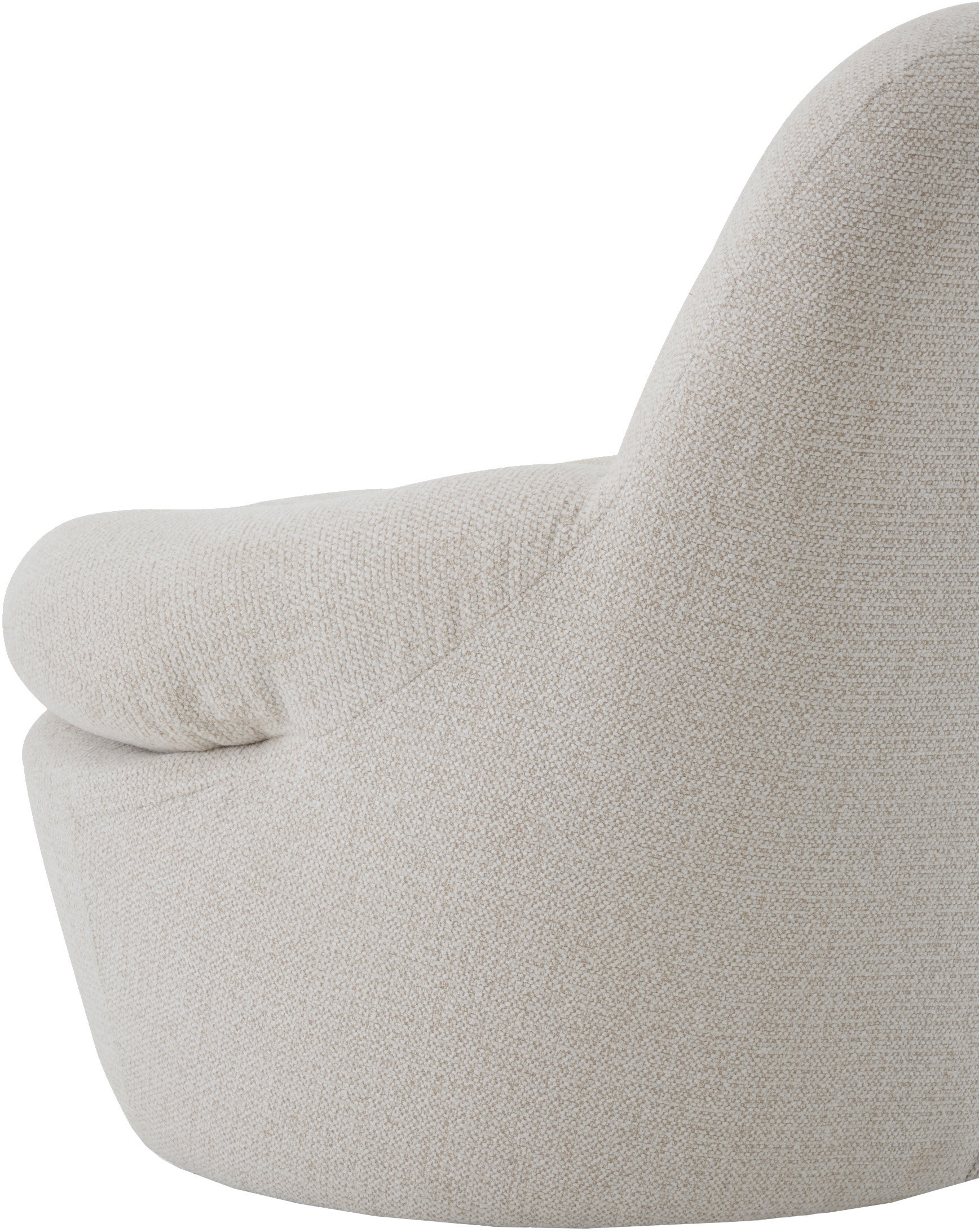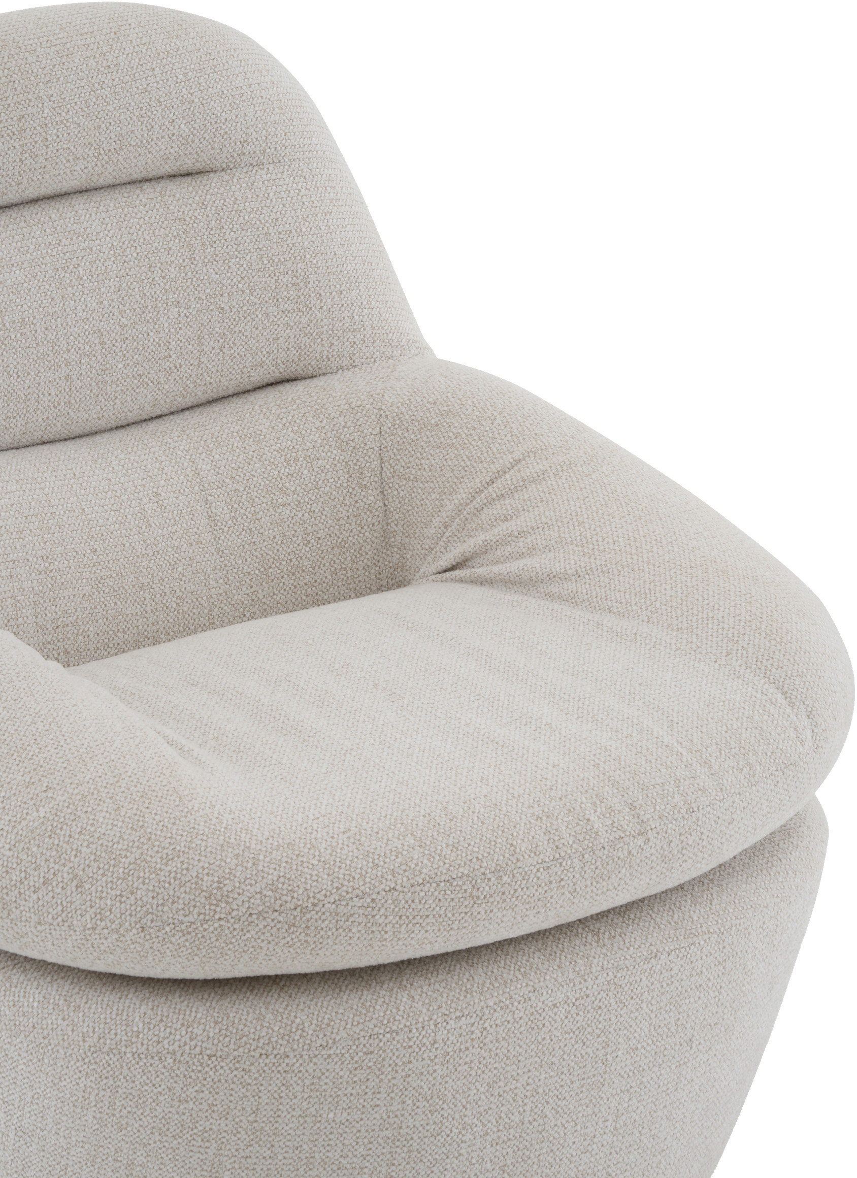 Кресло выполнено в современной лаконичной эстетике с плавными, обтекаемыми формами, придающими ему визуальную мягкость и уют. Элегантный цвет обивки делает модель универсальной — она легко впишется как в минималистичный, так и в скандинавский интерьер.