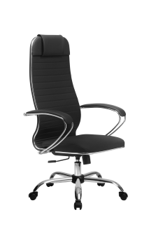 Спинка: высокая с мягким подголовником, черное полимерное покрытие каркаса с хромированным молдингом, ширина 475 мм