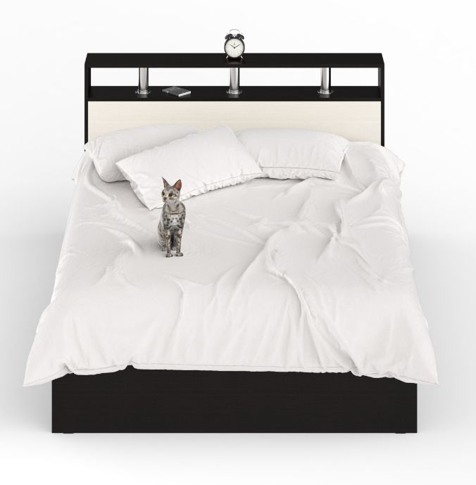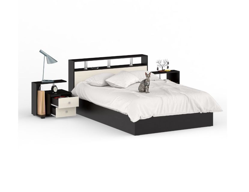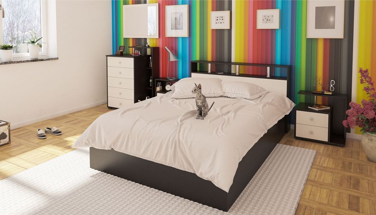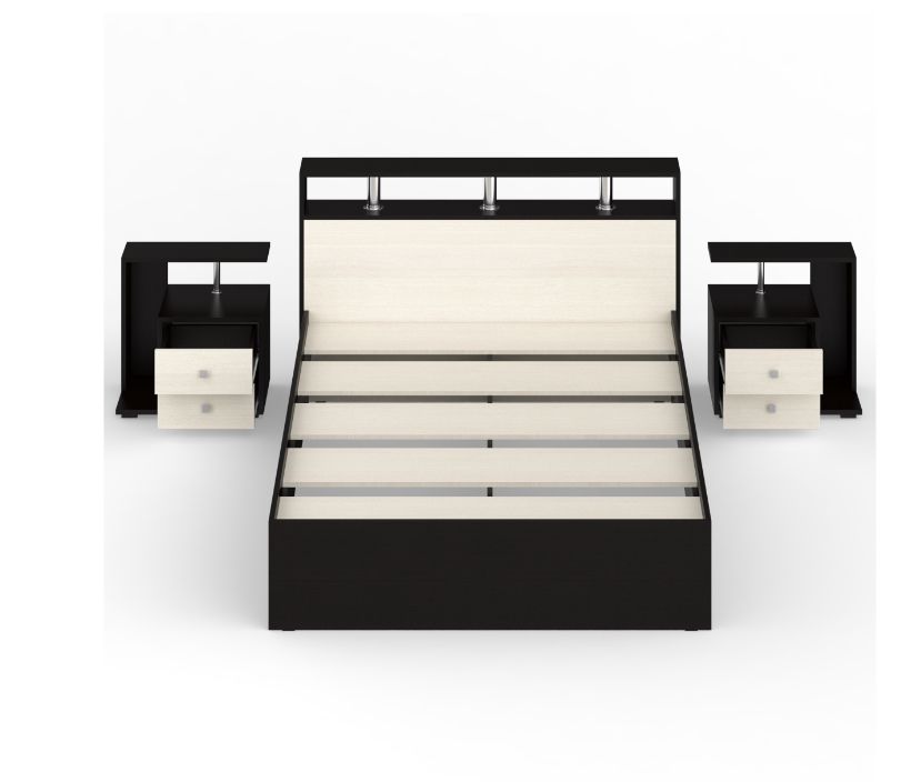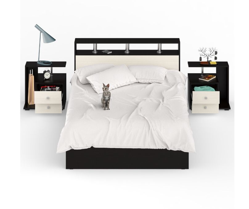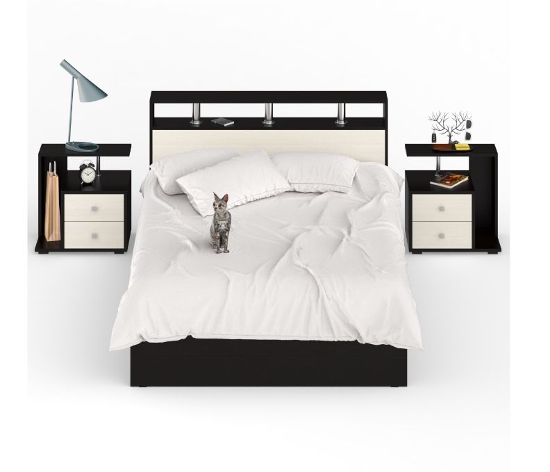 Кровать 1400 Камелия + две тумбы. Габариты (ШхГхВ) 256х217х78,2 см, сп.м. 1400х2000 мм. Удобная кровать с оригинальным изголовьем, декорированным хромированными стойками, станет основой респектабельного интерьера. Набор мебели включает две прикроватные тумбы – в правом исполнении (выдвижные ящики расположены слева) и левом (ящики – справа).