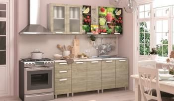 Яркая, стильная и современная кухня “Санрайс” станет настоящим украшением Вашего дома. Сочные образы верхних фасадов, нанесенные при помощи фотопечати, стеклостворки в МФД рамке и декор натурального дуба на нижних фасадах с покрытием soft touch создадут неповторимый коктейль Вашего интерьера.
