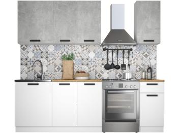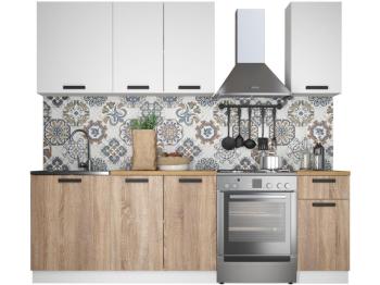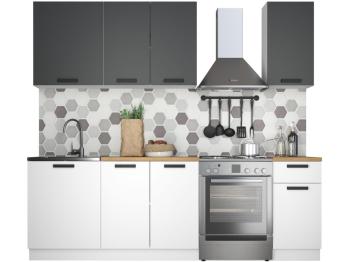Столешница в комплект не входит. Верхние шкафы имеют высоту 720 мм и включают одну полку без кромки на закрытых торцах. Модуль под мойку не содержит полки и задней стенки, а пластиковый цоколь белого цвета высотой 100 мм завершает образ гарнитура. Этот комплект станет стильным и практичным выбором для вашей кухни, сочетая комфорт и функциональность.