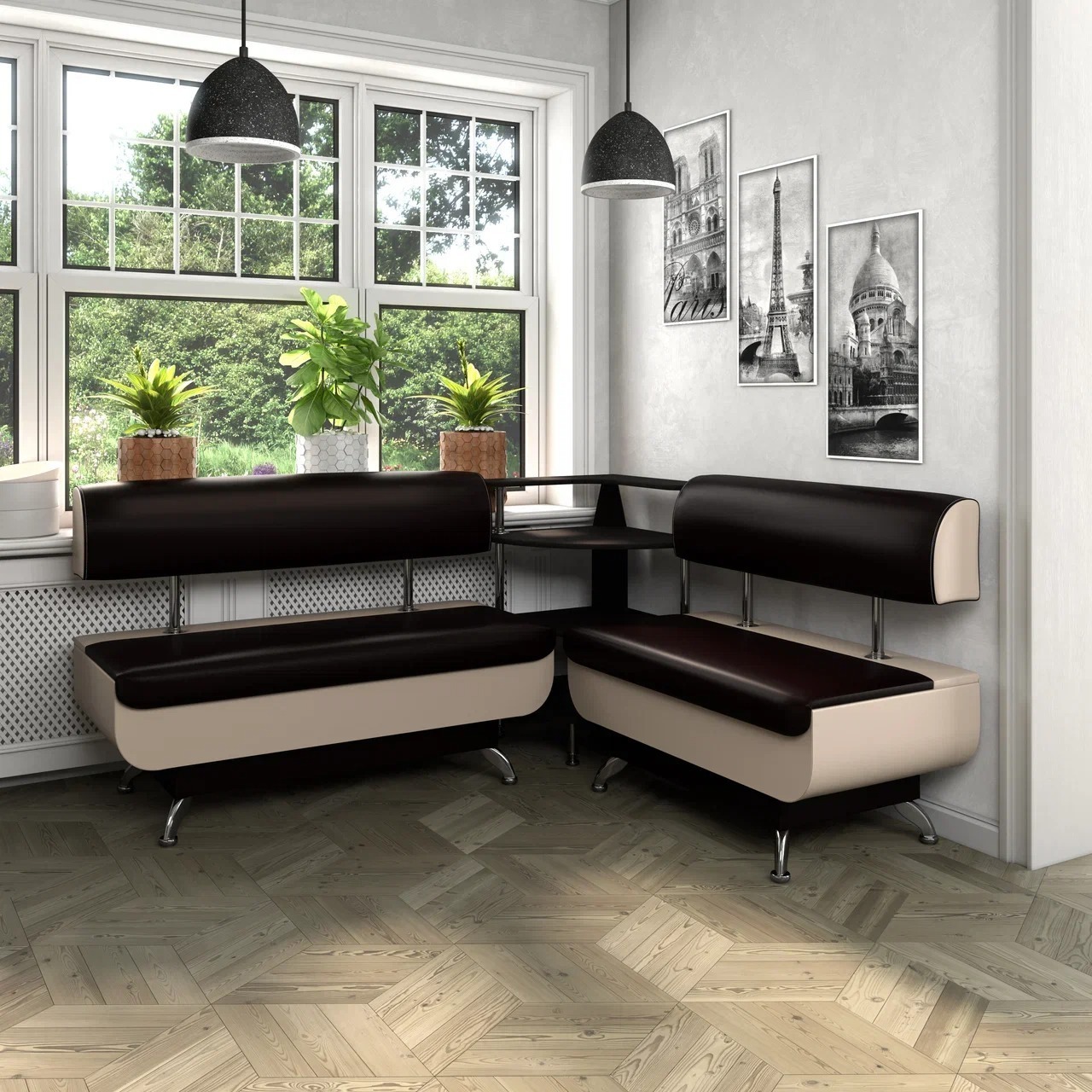 Кухонный угловой диван Валенсия - оригинальный элемент интерьера кухни с легким воздушным дизайном. Идеально впишется в самый современный интерьер. Диван установлен на металлические хромированные ножки, а вместительные ящики для хранения порадуют любую хозяйку. Связующим элементом дивана является открытая этажерка. Угол дивана универсальный, собирается и в левом и правом исполнении.