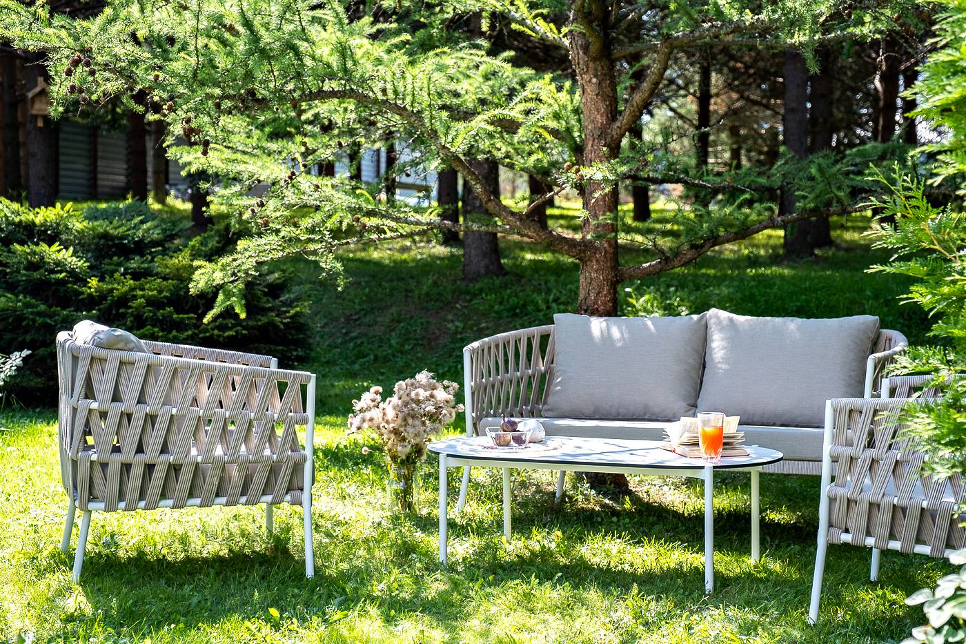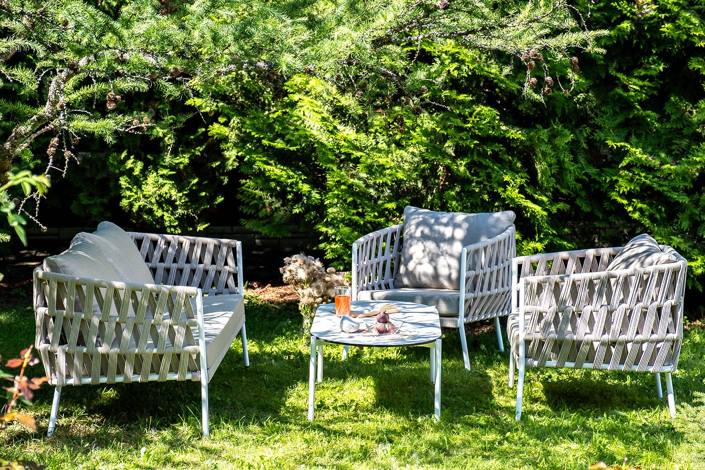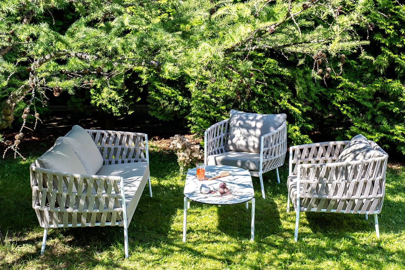 Каркас уличной мебели выполнен из износостойкого алюминия. Его дополняет темно-серая ручная оплетка, изготовленная на основе эластичных синтетических лент из полиэфирных волокон высокой прочности (роупа).