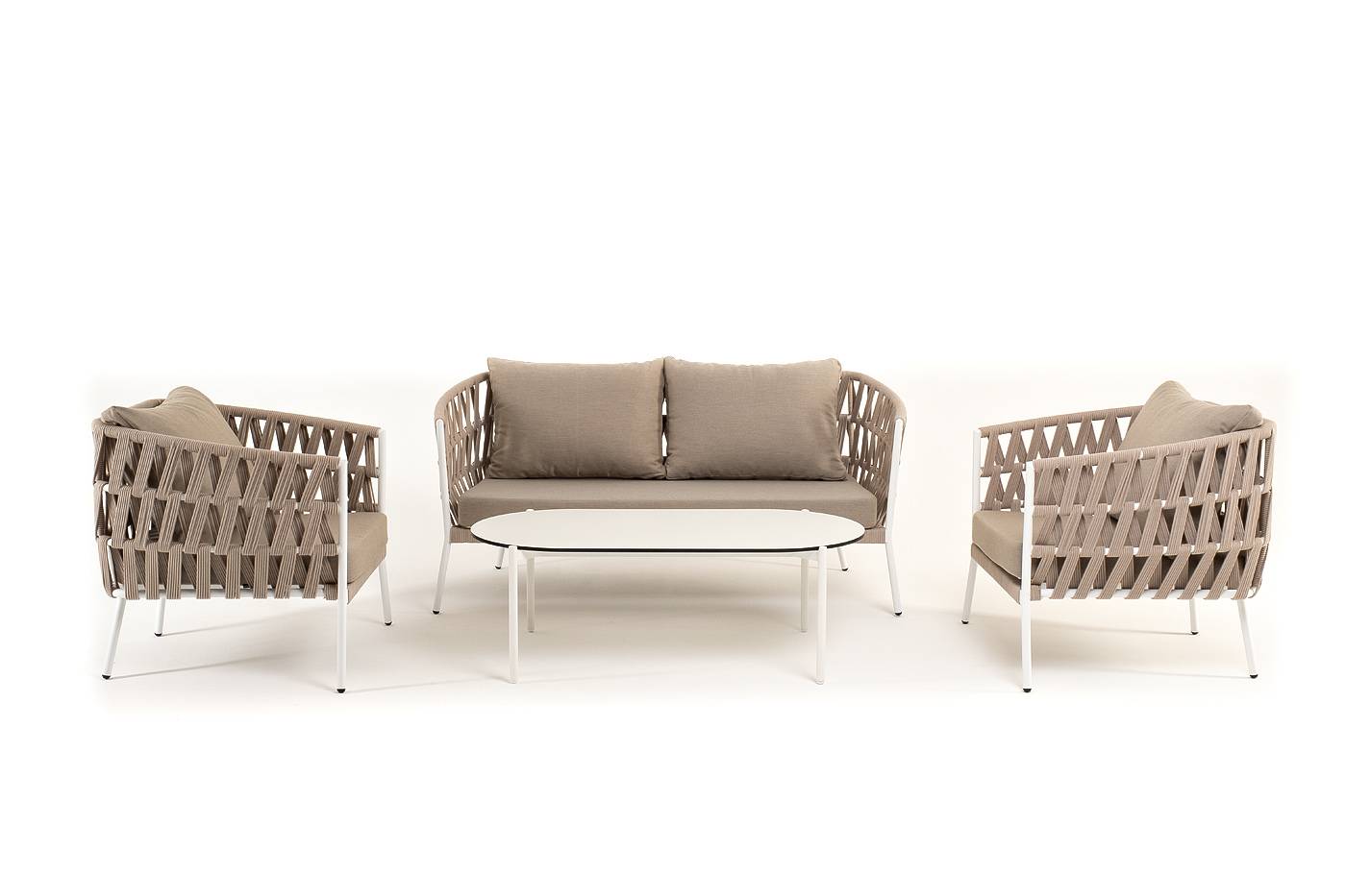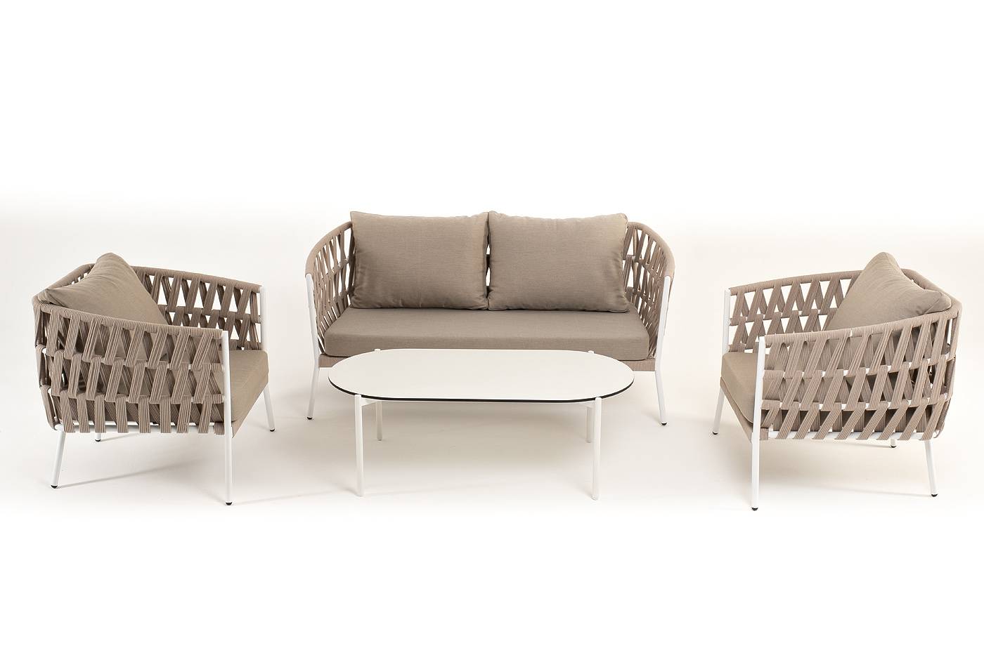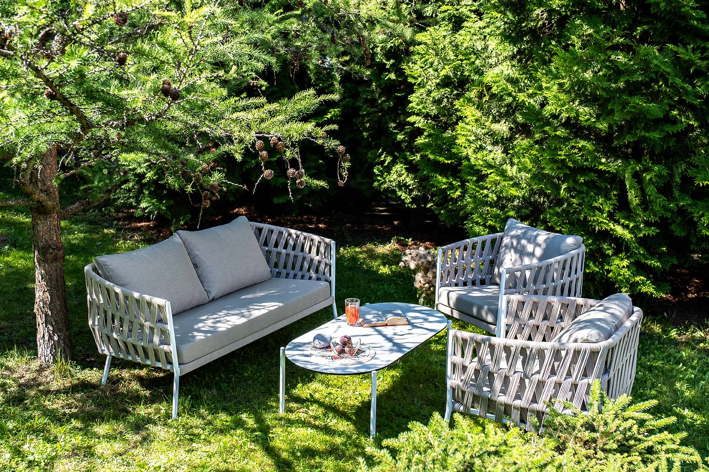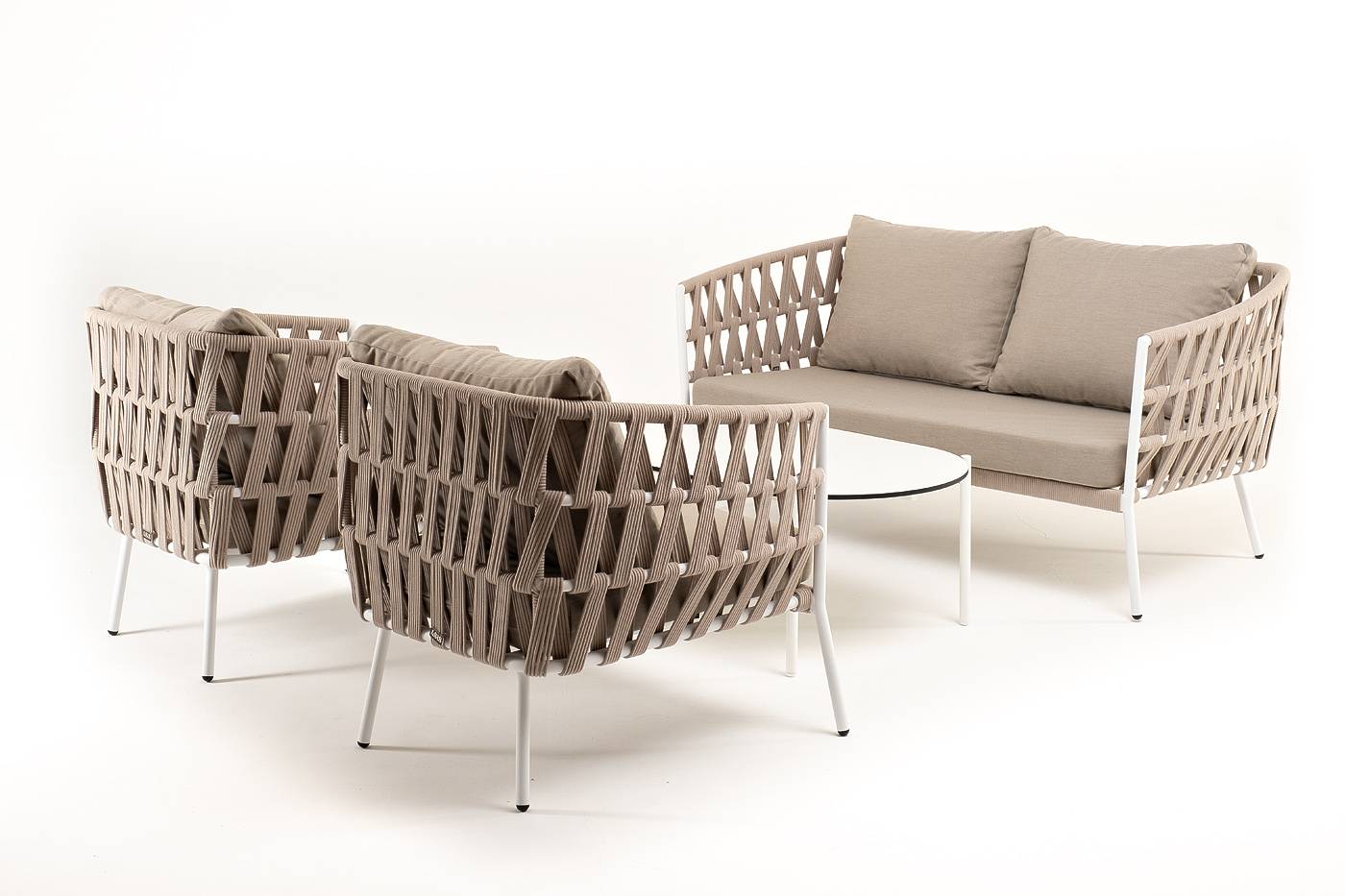 Каркас уличной мебели выполнен из износостойкого алюминия. Его дополняет темно-серая ручная оплетка, изготовленная на основе эластичных синтетических лент из полиэфирных волокон высокой прочности (роупа).