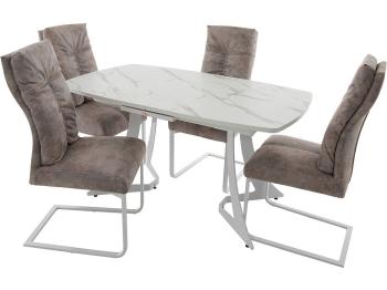 Столешница выполнена из МДФ и облицована итальянским пластиком премиум-класса, что придаёт изделию элегантный вид. Стулья имеют прочный металлокаркас и дополнены скобой из матированной стали, что обеспечивает надёжность и комфорт.