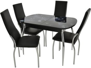 Обеденная группа «ДМФ Аврора Стол Ривьера СВ фотопечать и 4 стула Асти» — это стильный комплект, который включает в себя стол с фотопечатью Текстура 9 в черном исполнении и четыре стула «Асти», обитые кожзамом Батлер 07 с хромированными опорами. Изготовленная Димитровградской мебельной фабрикой «Аврора», эта мебель сочетает в себе элегантность и практичность.