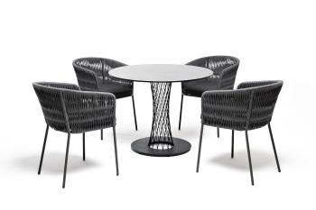 Вместе с этим, в комплектацию входит 4 плетеных стула «Бордо», выполненных с использованием высокопрочного роуп-волокна серого цвета с плетением вида «колос». Стулья имеют размеры 570×620×775 мм и устойчивый каркас из стали, окрашенной порошковой краской в тон материала плетения.