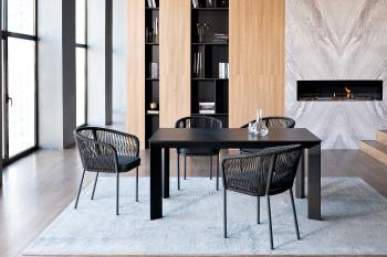 - 4 плетеных стульев «Марсель» из роупа, размером – 570×620×775 мм, цвет роупа – темно-серый, каркас из алюминия, окрашен порошковой краской в темно-серый оттенок.