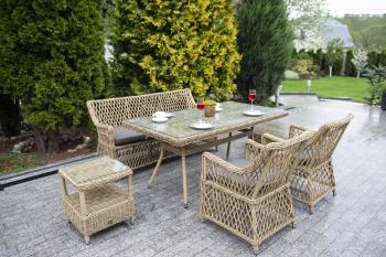 Обеденная группа выполнена в натуральном соломенном цвете и дополнит любой экстерьер в классическом стиле.