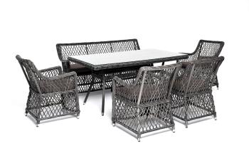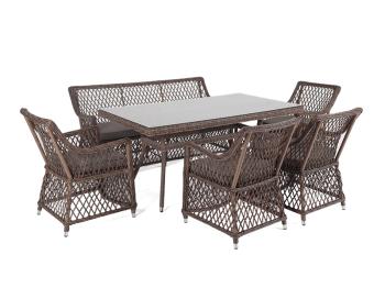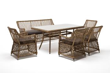 Все предметы мебели изготовлены из прочного алюминия, вручную оплетенного долговечным искусственным ротангом. На креслах и диване предусмотрены подушки со съемными чехлами и влагостойкой пропиткой. Стол укомплектован прочным стеклом толщиной 5 мм для удобства использования.