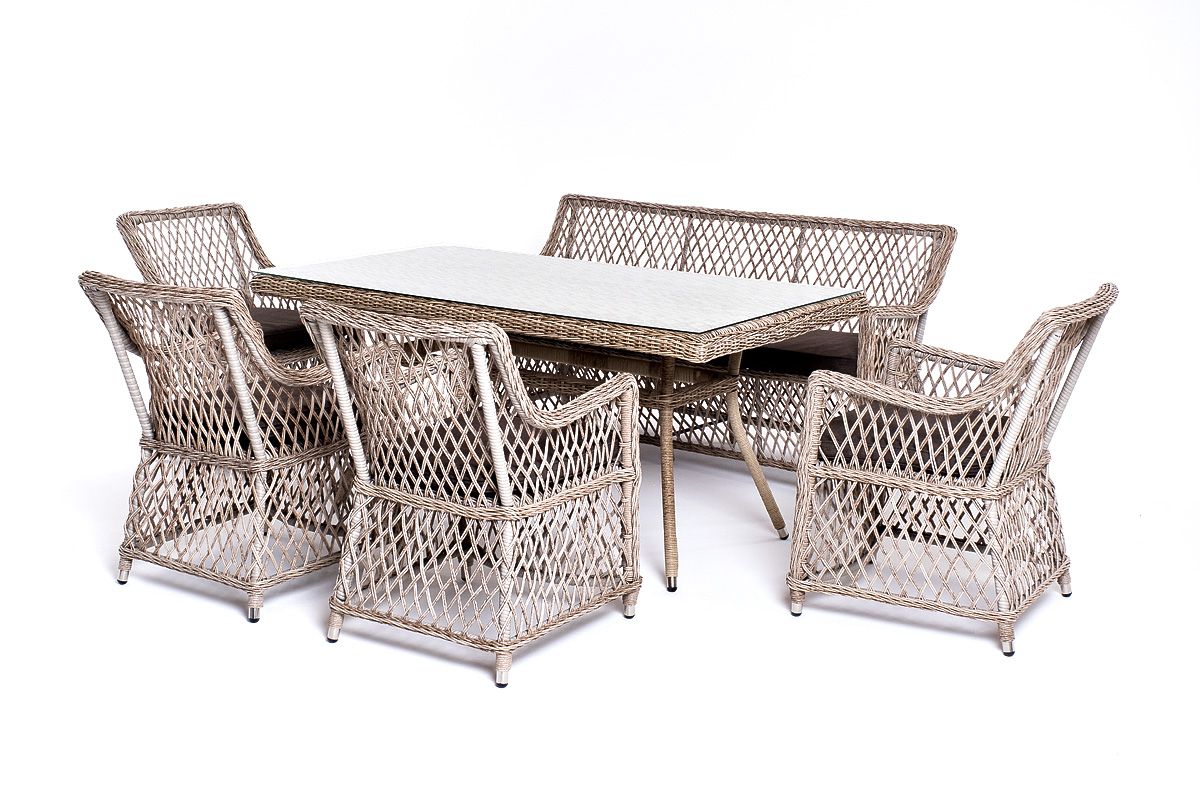 Обеденная группа выполнена в бежевом цвете. Комплект дополнит любой экстерьер в классическом стиле.
