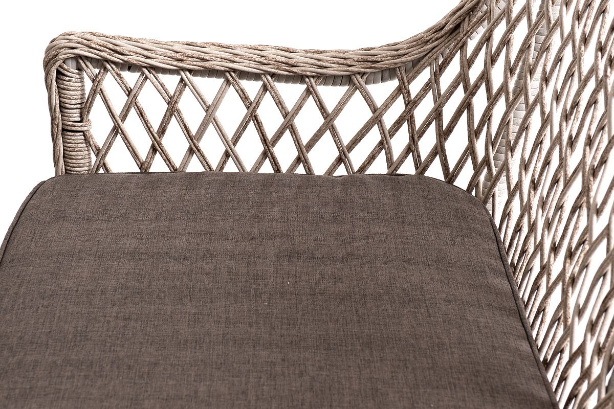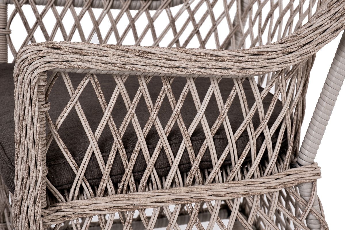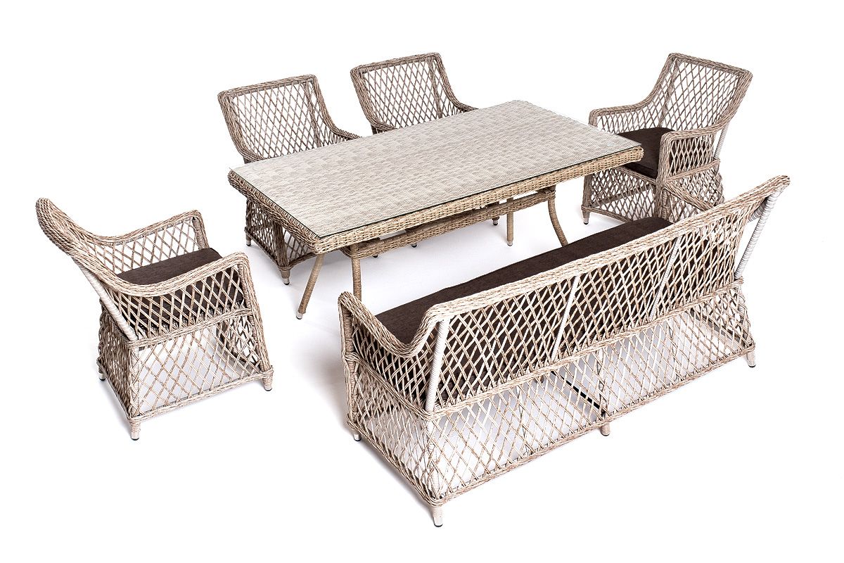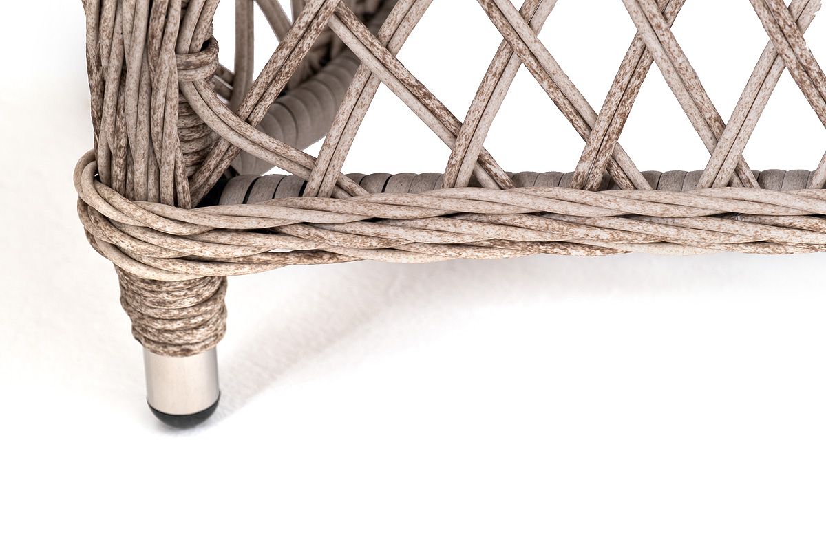 Все предметы мебели изготовлены из прочного алюминия, вручную оплетенного долговечным искусственным ротангом. На креслах и диване предусмотрены подушки со съемными чехлами и влагостойкой пропиткой. Стол укомплектован прочным стеклом толщиной 5 мм для удобства использования.